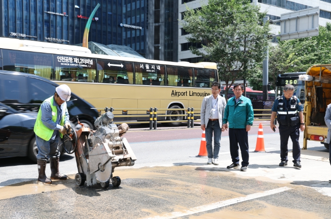 ▲ 박강수 마포구청장이 공덕동오거리 상수도관 파열로 추정되는 사고 현장을 살펴보고 있다 |