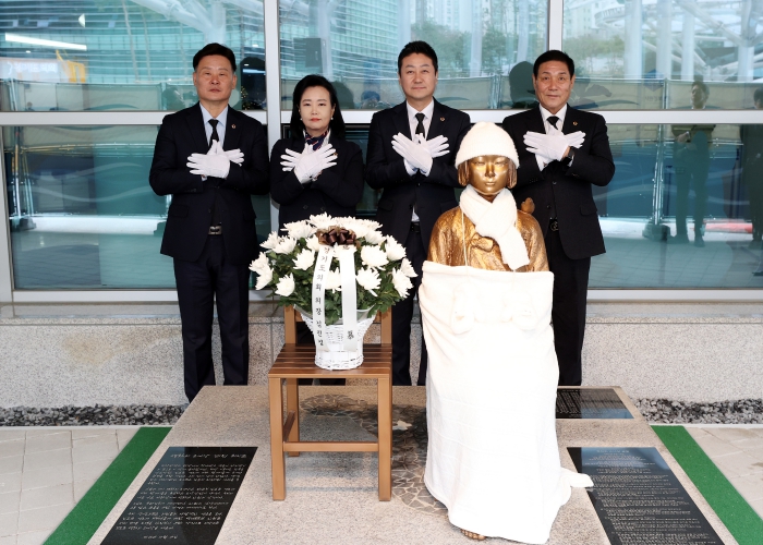 김 의장은 이날 도의회 1층에 위치한 평화의 소녀상 앞에서 헌화와 묵념을 하며 일본군 성노예 피해자들의 희생을 기렸다.