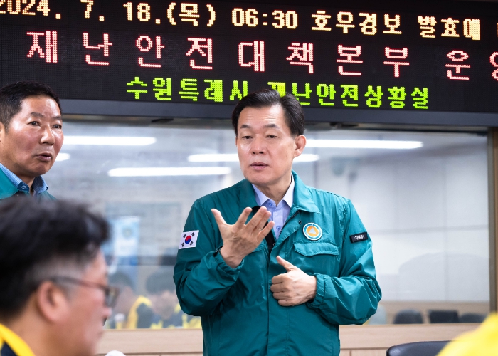18일 오전 6시 30분 수원시에 호우경보가 발효됐다. 수원시는 호우 상황을 모니터링하며 상황이 발생하면 신속하게 대응하고 있다. 이재준 수원시장은 호우경보가 발효된 후 시청 재난안전대책본부를 찾아 호우 상황을 점검하고, 직원들을 격려했다.