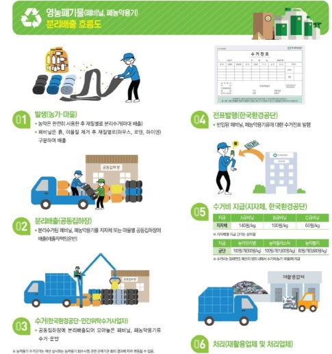 영농폐기물은 영농폐비닐(하우스, 멀칭, 로덴용 비닐)과 폐농약용기류(농약빈병, 농약봉지)로 분류되며 마을 단위로 설치된 공동집하장에 보관 후 한국환경공단 민간위탁수거사업자가 공단 영농폐비닐 재활용시설(안성)으로 이송하여 처리된다. 수거된 폐비닐은 파쇄, 세척, 압축해 재생 원료로 재활용하고 농약 용기는 재활용하거나 소각 처리된다.