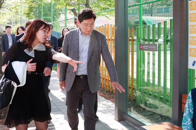 이 시장은 당시 간담회가 끝나자마자 청곡초 앞 현장을 찾아 “학교 앞 승하차구역에 햇빛을 막는 캐노피가 있지만 날이 더울 때나 눈비가 올 때면 학생들이 냉ㆍ온열 의자가 설치된 인근 버스정류장에 가서 앉아 있다가 승하차구역으로 차가 오면 급하게 뛴다고 하니 캐노피 아래에도 냉ㆍ온열 의자를 설치하는 게 좋겠다”고 시 관계자들에게 말했다.