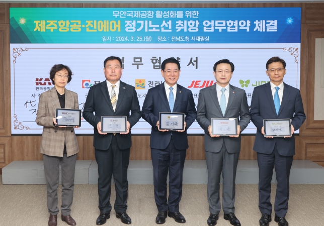 [뉴스서울] 전남 무안군은 25일 김산 무안군수, 김영록 전남도지사, 제주항공 대표 김이배, 진에어 대표 박병률, 한국공항공사 허주희 본부장과 함께 무안국제공항 활성화를 위한 업무협약을 체결했다.