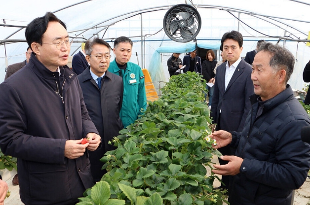 ▲ 윤병태 시장이 지난 3월 8일 남평읍, 세지면 지역 딸기·멜론 재배 농가를 방문해 일조량 부족에 따른 농작물 피해 현황을 점검하고 있다. |