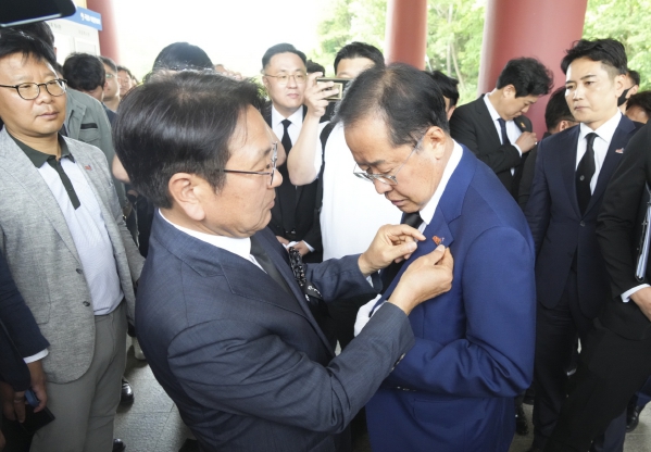 | ▲ 강기정 광주광역시장이 제44주년 5·18민주화운동 기념식을 하루 앞둔 17일 오전 북구 운정동 국립5·18민주묘지를 찾은 홍준표 대구광역시장에게 5·18 배지를 달아주고 있다./광주광역시 제공 |