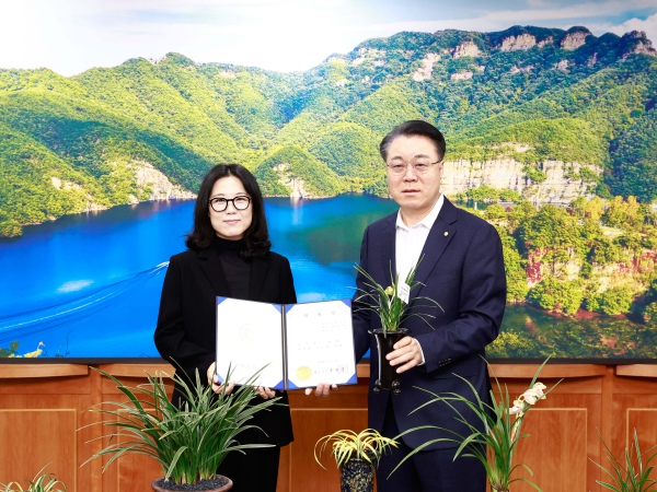 [뉴스서울] 구복규 화순군수가 다자녀 양육을 위해 장기간 육아휴직 후 복귀한 복직 직원 임용장 수여식에서 난(蘭)을 선물했다.