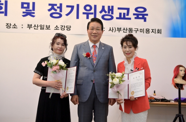 [뉴스서울] 김진홍 부산 동구청장은 지난 14일 9시, 부산일보 강당에서 열린 (사)대한미용사회 부산광역시 동구지회 정기총회 및 정기위생교육에 참석하여 공중위생수준 향상 유공자(문성숙/다사랑, 박미홍/쎄시박헤어) 2명에게 표창장을 수여했다.