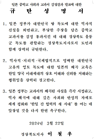 이철우 경상북도지사는 이날 규탄성명서를 통해 ‘대한민국 땅 독도’에 대하여 역사적 진실을 외면하고 부당한 주장을 담은 일본 중학교 사회과 교과서를 또다시 검정 통과시킨 데 대해 경상북도 울릉군 독도를 관할하는 경상북도지사로서 도민과 함께 강력히 규탄했다.