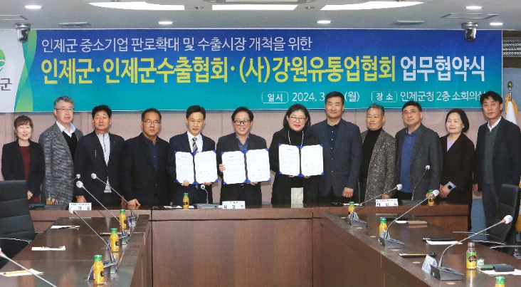 [뉴스서울] 인제군이 지난 18일 인제군수출협회·(사)강원유통업협회와 함께 지역 중소기업 판로 확대 및 수출시장 개척을 위한 업무 협약을 체결했다.