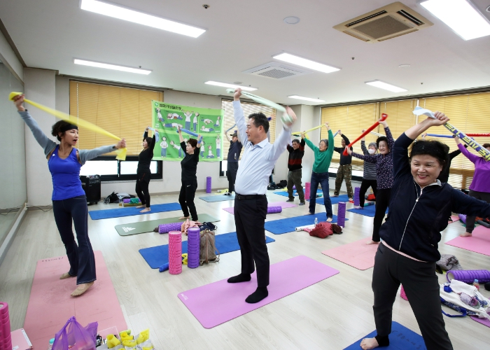 이날 신영재 홍천군수는 노인 여가교실 어르신들과 함께 몸펴기 생활운동, 노래교실, 라인댄스를 배우는 시간을 가졌고, 직접 배식봉사를 실시했다.
