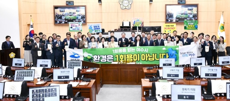 여수시의회(의장 김영규)는 지난 4월 29일 여수시의회 전체 의원과 의회사무국 직원 등 40여 명이 참여한 가운데 환경 오염 및 자원 낭비를 예방하기 위한 ‘일회용품 없는 공공청사 만들기’ 캠페인을 실시했다.