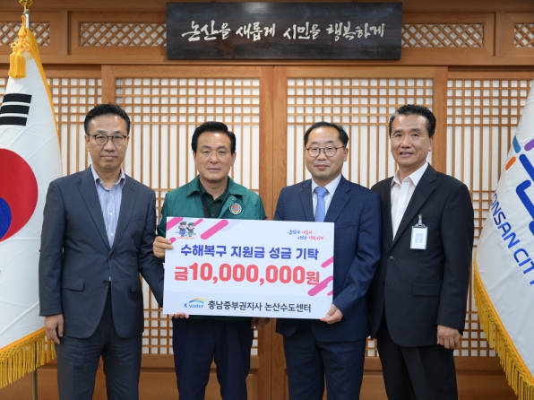 [뉴스서울] K-water 충남중부권지사 논산수도센터는 17일 집중호우 피해로 특별재난지역으로 선포된 논산시를 방문해 수재의연금 1천만원을 전달했다.