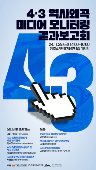 발표는 ▲김수정(민주언론시민연합 공동대표):‘4・3, 3년간의 언론 보도와 댓글 분석결과’▲유승현(민주언론시민연합 정책위원): ‘4・3, 5년간 유튜브 콘텐츠 및 댓글 분석결과’▲이용성(민주언론시민연합 정책자문위원): ‘4・3, 왜곡・폄훼 유형과 대응방안’을 각각 맡아 진행한다.