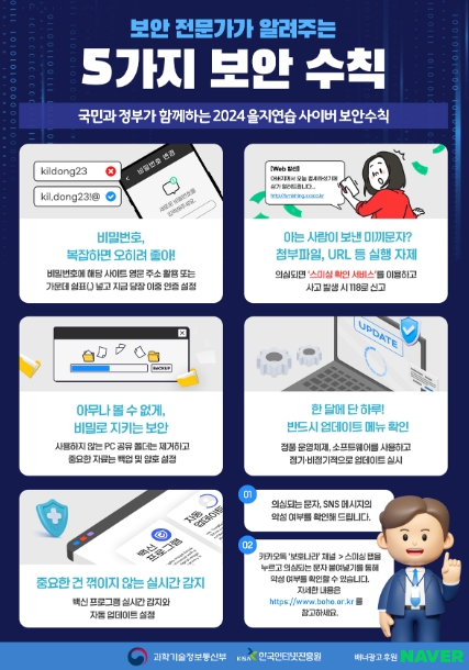 보안수칙 홍보는 ▲ 안전한 비밀번호 설정 ▲ 의심문자(스미싱) 실행 자제 및 확인 안내 ▲ 중요자료 복사(백업) 및 암호 설정 ▲ 주기적 갱신 ▲ 백신 프로그램 활용의 내용을 담고 있으며, 한국인터넷진흥원, 보호나라 누리집에서 확인이 가능하다.