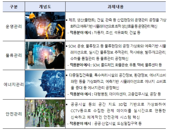 먼저, 운영관리 분야는 제조, 생산, 건설 등 산업현장의 운영관리 공정 가상화 및 최적생산, 유연생산, 예방정비 등이 가능한 '메타버스 운영관리 플랫폼 개발 및 실증' 과제에 대해 2년간 최대 40억원을 지원한다.