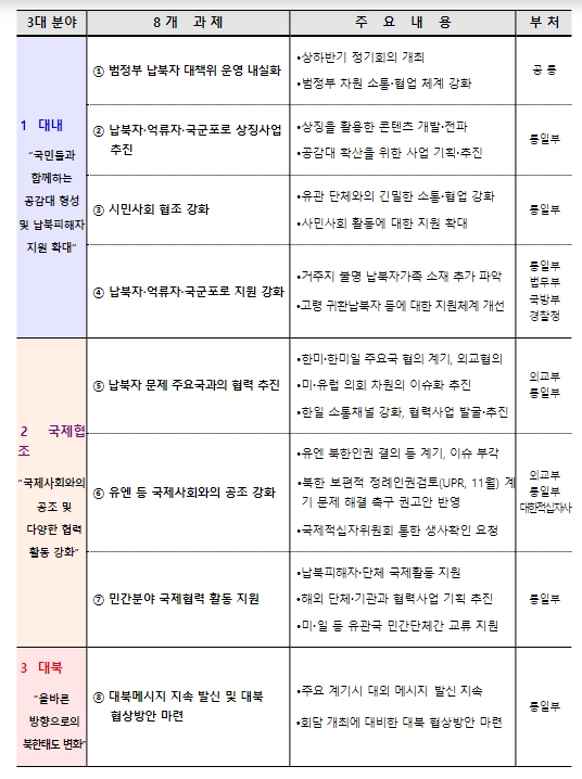 셋째, 대북 분야에서는 “올바른 방향으로의 북한의 태도 변화”를 목표로 ∆주요 계기시 납북자억류자 생사확인 및 송환 촉구 등 대북메시지를 지속 발신하는 가운데, ∆남북대화 재개를 대비한 치밀한 대북 협상방안을 마련해 나가기로 했다.