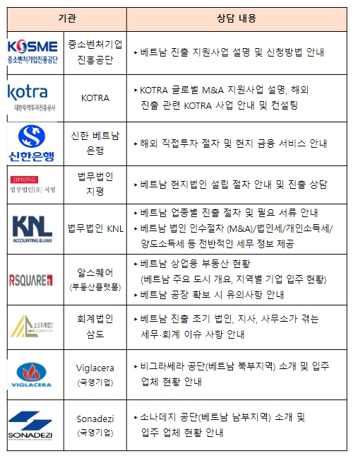 중소벤처기업진흥공단, 코트라 등 해외진출을 지원하는 공공기관과 신한은행을 포함한 법무‧회계법인 등 다양한 분야의 민간기관이 참여했으며, 기관별 전문성을 바탕으로 베트남 현지 시장‧경제동향, 베트남 진출 관련 법률‧회계‧금융‧투자 분야 정보제공 설명회와 기관별 부스를 통한 1:1 상담회가 진행됐다.