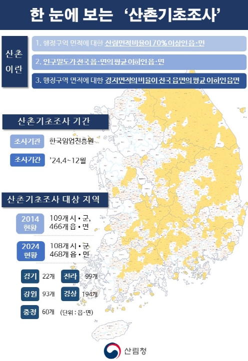 [뉴스서울] 산림청(청장 남성현)은 임업분야 및 산촌지역 활성화를 위해 전국의 산촌 468개 읍・면에 대한 기초조사를 실시한다고 17일 밝혔다.