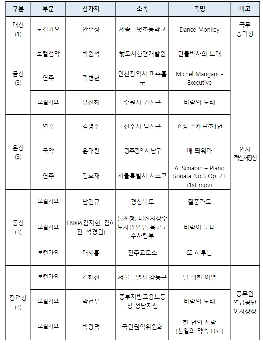 한편, 공무원 음악제는 공무원의 자기 계발과 활기찬 공직문화 조성을 위해 지난 2007년부터 매년 개최되고 있다.