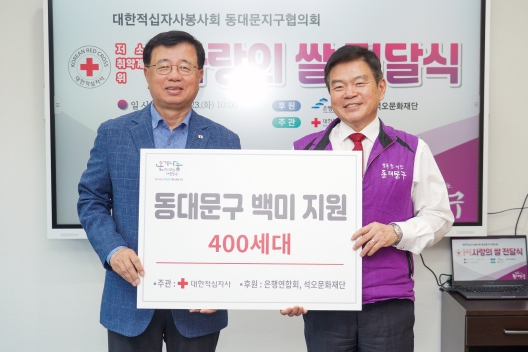 기부된 백미는 동대문지구협의회가 전국은행연합회와 석오문화재단으로부터 후원받은 쌀로, 이날 대한적십자사봉사회 동대문지구협의회를 통해 관내 저소득 취약계층 400세대에 전달됐다.