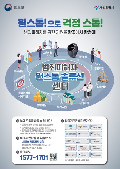 ‘범죄피해자 원스톱 솔루션 센터’는 서울여성플라자 3층(대방역 3번 출구)에 위치하고 있으며, 문의는 1577-1701로 하면 된다.