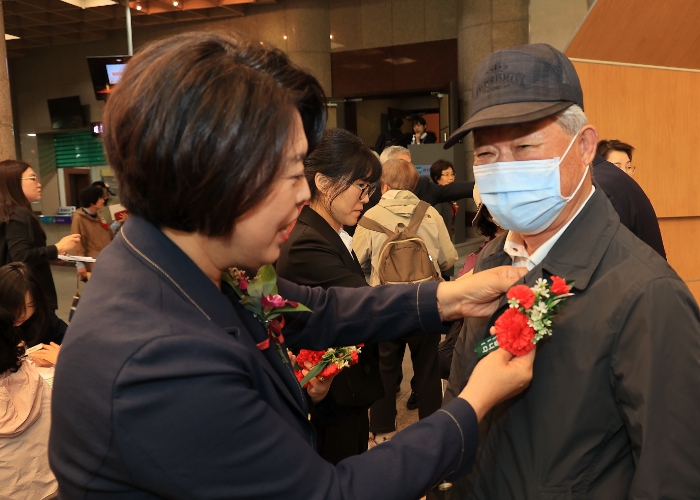 신계용 과천시장은 행사장에서 어르신들게 일일이 카네이션을 달아드리고 감사와 존경의 인사로 맞이했다.