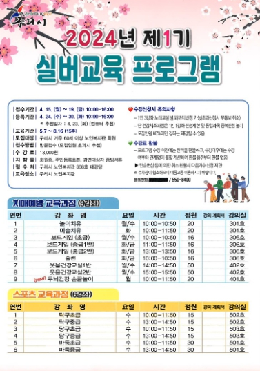 2024년 제1기 실버교육 프로그램은 8개 과정 121강좌 2,909명 정원으로 구성되어 있으며, 오는 5월 7일부터 8월 16일까지 15주간 구리시 노인복지관에서 진행될 예정이다. 교육 대상은 구리시 노인복지관 회원으로, 1인당 3강좌(노래교실 별도)까지 신청이 가능하며, 수강료는 13,000원이다.