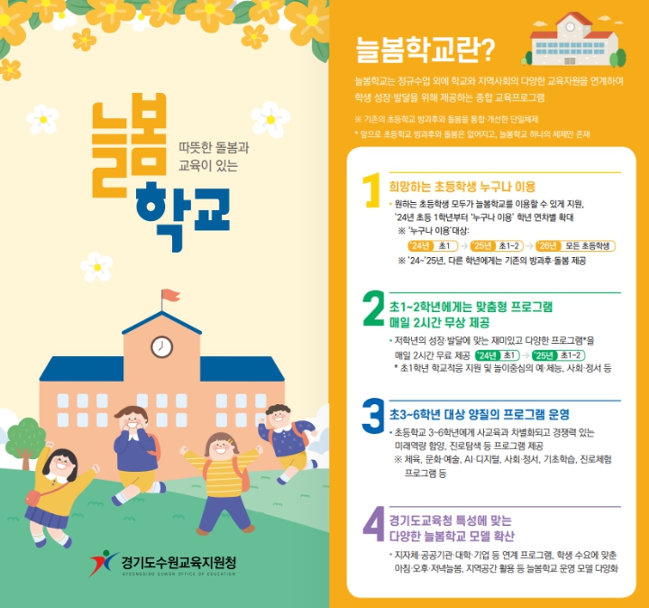 홍보 콘텐츠는 늘봄학교 정책에 대한 안내와 이미지로 구성된 리플릿, 교육지원청과 수원시청이 함께 제작한 늘봄지도, 늘봄학교를 인포그래픽으로 소개하는 홍보 영상 등으로 구성됐다.