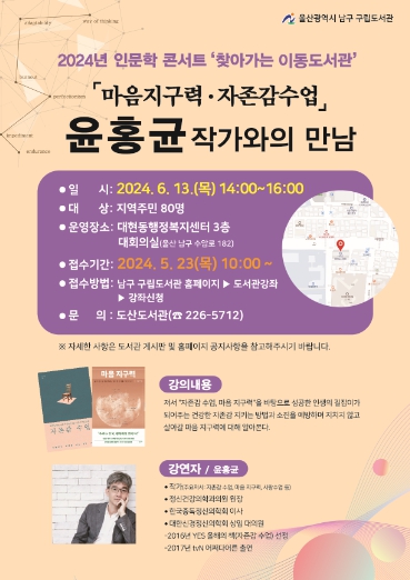 [뉴스서울] 울산 남구 도산도서관은 인문학 콘서트 ‘찾아가는 이동도서관’ 윤홍균 작가와의 만남을 6월 13일 대현동행정복지센터에서 운영한다고 밝혔다.