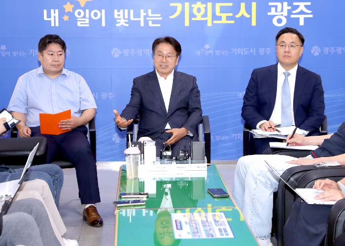▲ 강기정 광주광역시장이 3일 오전 시청 5층 기자실에서 출입기자들과 차담회를 갖고 시정 주요현안 등에 대해 설명하고 있다./ 광주광역시 제공 |