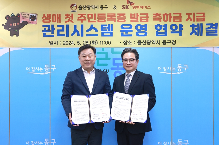 동구는 이에 따라 5월 28일 오전 11시 구청장실에서 김종훈 동구청장과 SK엠앤서비스 김창현 상무 등이 참석한 가운데 원만한 사업 추진을 위한 울산 동구 & SK 엠앤서비스(대표 허선영) 간 생애 첫 주민등록증 발급 축하금 지급 사업운영 협약을 체결했다.