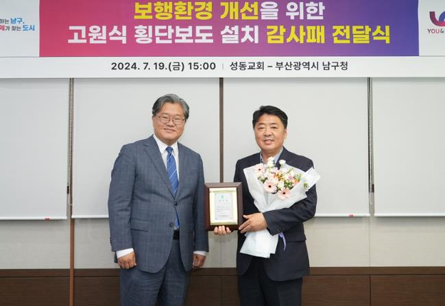[뉴스서울] 부산 남구는 19일에 고원식 횡단보도 설치로 안전한 보행환경을 조성한 것에 대해 성동교회로부터 감사패를 받았다.