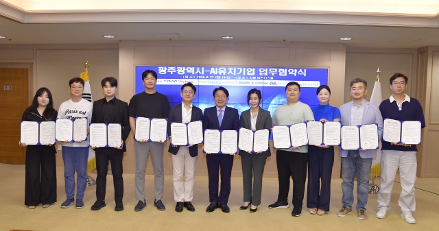 광주광역시는 27일 시청 비즈니스룸에서 클라이온, 디지털로그 테크놀로지스, 바이오컴, 인이지, 써로마인드, 두루미스, 정션메드, 엠 코포레이션, 헬프티쳐, 레스트오브 등 플랫폼‧헬스케어‧콘텐츠 등 다양한 분야의 인공지능(AI)기업 10개사와 204~213번째 업무협약을 체결했다.