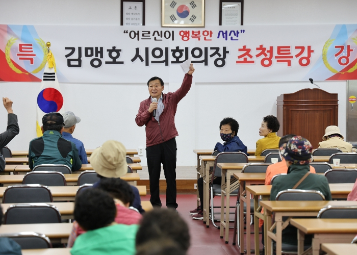 [뉴스서울] 서산시의회 김맹호 의장이 24일 대산노인대학을 찾아 ‘간신히 인생’을 주제로 특별 강연을 펼쳐 뜨거운 호응을 얻었다.