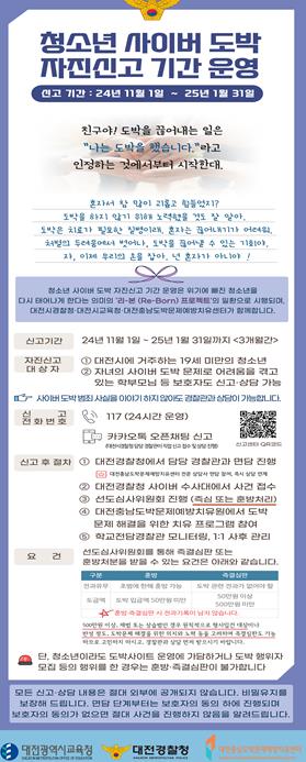 대전경찰청은 청소년 사이버 도박 자진신고 기간 운영을 시작으로 범죄 위험에 빠진 청소년이 다시 태어나길 바라는 마음을 담은 ‘리-본(Re-Born) 프로젝트’를 추진할 예정이며, 대전시교육청 등 관련 기관과 협업하여 범죄예방 교육, 캠페인 등을 지속 전개할 예정이다.