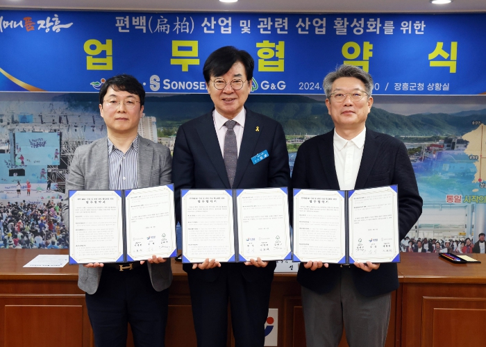 [뉴스서울] 장흥군은 4일 군청 상황실에서 ㈜대명소노시즌, ㈜지앤지와 ‘편백산업 활성화’를 위한 업무협약을 체결했다고 밝혔다.