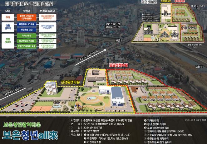 특히, 직역활력타운이 조성되는 보은읍 죽전리에는 현재 추진 중인 △온-누림 플랫폼 건립 사업 △군민 친화형 체육센터 △일자리 연계형 공공임대주택 100호 △어린이 놀이시설 조성 등 생활기반시설 사업으로 아이가 있는 신혼부부를 포함한 젊은 청년들의 주거지원 및 교육과 보육, 창업 활동을 지원할 수 있는 인프라를 연계 구축함으로써 보은군의 새로운 활력을 불어넣을 수 있는 새로운 중심 시가지를 조성할 것으로 기대를 모으고 있다.