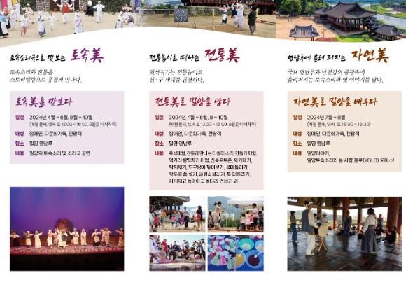 이날 행사는 지역 문화유산의 가치를 재발견하고 농경문화를 토속소리로 계승·발전시킨 토속소리극 공연과 국보 영남루의 역사, 건물, 편액 등에 대한 흥미로운 이야기 마당이 열린다.