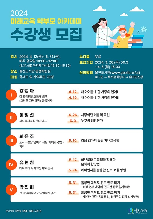 [뉴스서울] 경상북도교육청 울진도서관은 4월 12일부터 5월 31일 까지 학부모 및 일반인을 대상으로 '2024년 미래교육 학부모 아카데미'전문가 특강을 운영한다.