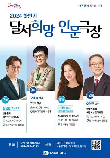 [뉴스서울] 대구 달서구가 2024년 하반기 달서희망인문극장을 7월 23일 심용환 역사학자의 강연을 시작으로 12월까지 4회 실시한다.