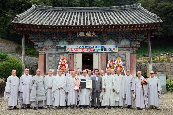[뉴스서울] 전북특별자치도 고창군이 16일 오전 고창 문수사에서 국가지정문화유산 보물로 승격된 ‘고창 문수사 대웅전’의 보물 지정서 전달식을 가졌다고 밝혔다.