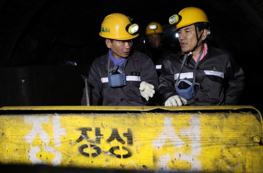 작업복으로 환복한 김 지사는 갱도로 내려가는 케이지로 이동한 뒤 광부들과 함께 작은 헤드랜턴에 의지한 채 63빌딩 4개 높이 이상의 지하 1,150m 깊숙한 갱도 안으로 들어가 석탄 캐는 작업을 함께 했다.
