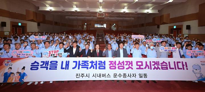 진주시는 26일과 29일 양일간에 걸쳐 능력개발관에서 시내버스 운수종사자 500여 명이 참석한 가운데 ‘2024년 시내버스 운수종사자 친절·안전운행 실천 다짐대회 및 친절기사 표창수여식’을 가졌으며, 참석한 시내버스 운전자들은 친절기사로 거듭날 것을 선서했다고 밝혔다.
