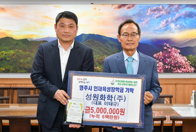 [뉴스서울] (재)영주시인재육성장학회는 7일 성원화학(주)에서 지역인재 육성을 위한 소중한 마음을 담아 인재육성장학금 5백만 원을 기탁했다고 밝혔다.