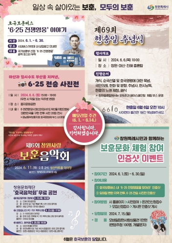 창원시는 ‘영웅을 기억합니다. 감사합니다. 기억하겠습니다’라는 주제로 메모리얼 주간을 운영하여 ‘전쟁영웅을 찾아라’ 호국보훈버스 운행, 6‧25 전승 사진전 개최와 현충일 추념식, 보훈 음악회, 보훈으로 하나 되기 위문사업 등 다양한 행사를 펼쳐 시민과 함께 국가유공자와 보훈 가족에게 존경과 감사를 전할 계획이다.