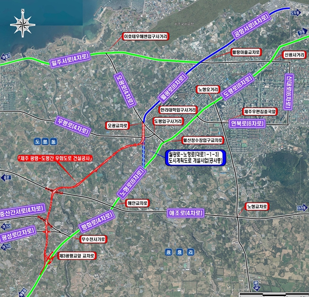 이번 공사는 제주시와 서귀포시간 통행시 노형오거리, 무수천 교차로 등 도심지 내 상습 정체구간을 거치지 않고 평화로 제2광령교에서 제주공항까지 우회도로를 개설하는 공사다.
