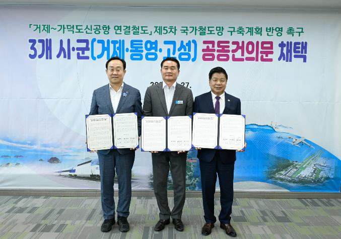 박종우 거제시장, 천영기 통영시장, 이상근 고성군수는 지난 27일 거제시청에서 거제-가덕도신공항 연결철도를 제5차 국가철도망 구축계획에 반영해달라는 내용의 공동건의문에 함께 서명했다.