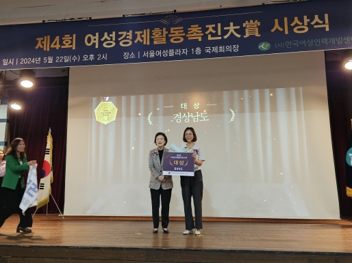 [뉴스서울] 경상남도는 ‘제4회 여성경제활동촉진 대상(大賞)’ 공모에서 최고상인 대상 수상의 영예를 안았다고 밝혔다.