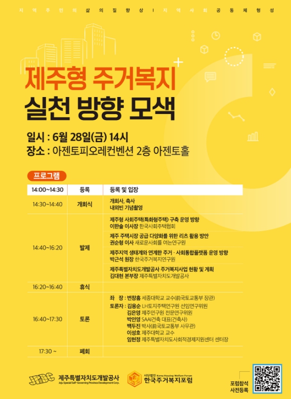 [뉴스서울] 제주개발공사(사장 백경훈)와 (사)한국주거복지포럼(이사장 이상한)은 “제주형 주거복지 실천 방향 모색”이라는 주제로 주거복지 전문가를 초빙하여 도민과 함께하는 제주 주거복지 포럼을 6월 28일 14시부터 아젠토피오레컨벤션(아젠토홀)에서 공동 개최할 예정이다.