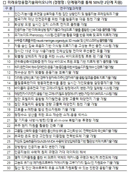 미래유망융합기술파이오니어는 신기술·신산업을 개척하고 패러다임을 바꿀 수 있는 도전적이고 혁신적인 기초・원천 융합연구를 최대 6년, 年 4~12억원 지원하며, 주요 선정과제는 다음과 같다.