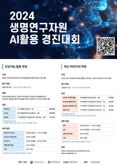 '2024년 생명연구자원 인공지능활용 경진대회'의 세부내용은 국가 생명 데이터 스테이션 누리집 및 생명 소재 정보 통합 온라인체제 기반 및 국가생명연구자원정보센터 누리집에서 확인할 수 있다.
